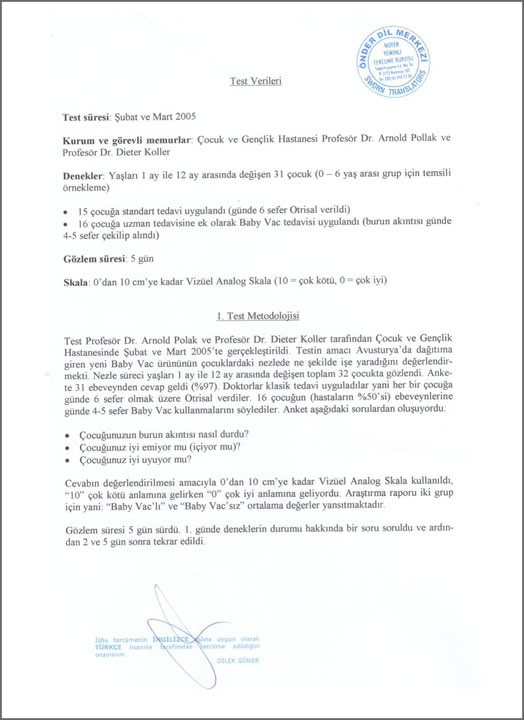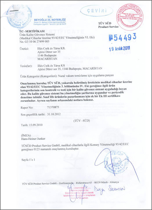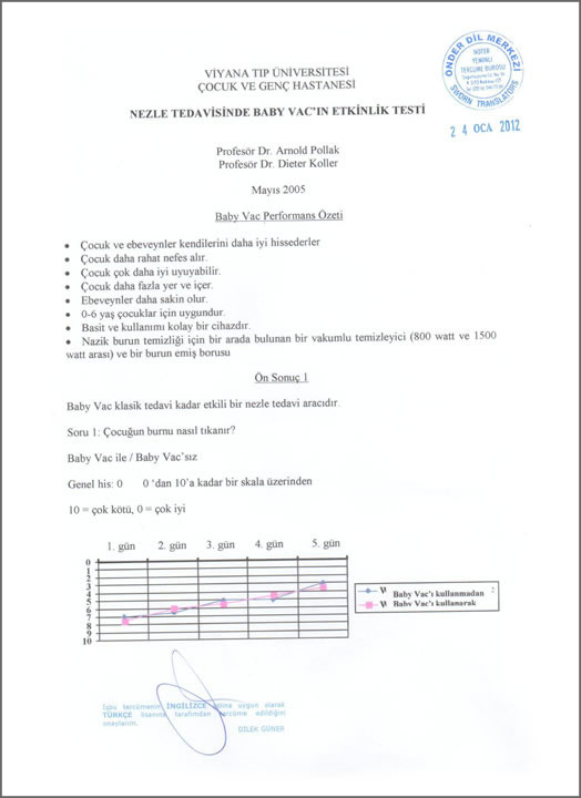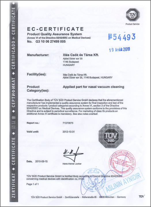 Akustik rinometri ve rinomanometri departmanlarımızda bu ürünü 10 çocuk ve 5 yetişkin üzerinde test ettik. Burundaki rahatsız edici salgıları sorunsuz olarak çıkarabiliyor. Cihazın kullanımı çok kolay, etkili ve çocuklar rahatlıkla alışabiliyorlar. Kullanım esnasında herhangi bir yara veya hasar oluşmadı, zaten cihazın tasarımı nedeniyle olumsuz bir durum beklenmiyordu. Macar meslektaşlarımın bu iyi niyetli ve başarılı çalışmalarını destekliyor, doktorlar tarafından hastanelerde ve ebeveynler tarafından evlerde kullanımını tavsiye ediyorum.