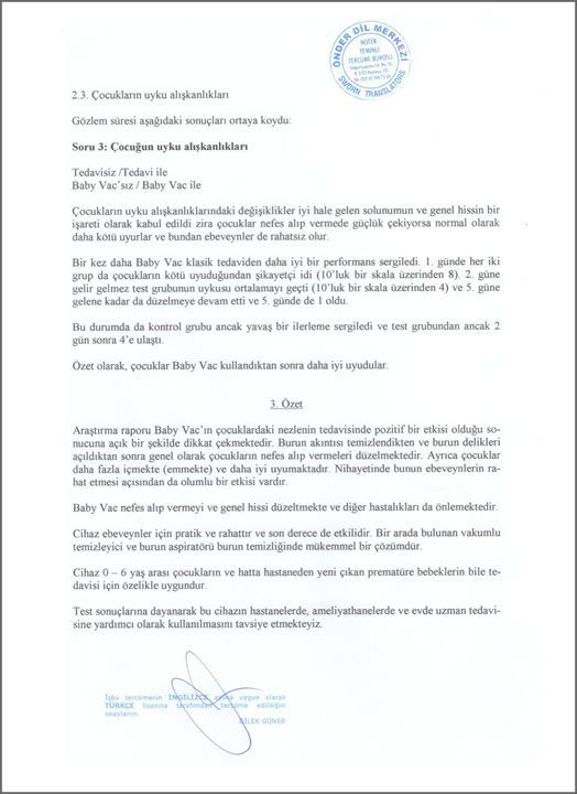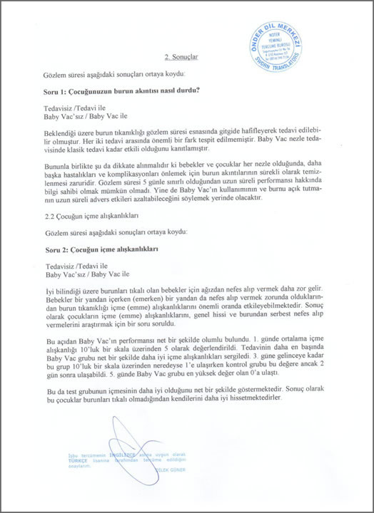 Tecrübelerimiz gösteriyor ki, Baby-Vac çocuğun soğuk algınlığından kurtulmasına çok yardımcı oluyor ve çocuklar bu sayede daha iyi beslenebiliyorlar. Temiz burunları sayesinde daha iyi uyuyorlar. Aynı zamanda Baby-Vac kullandığımız çocukların tekrarlayan sorunlar için daha az geldiğini de fark ettik.